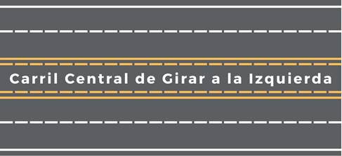 Notará que en Texas, muchas carreteras de tránsito en ambas direcciones tienen un carril en el medio de ambas vías enmarcado por líneas amarillas. Este carril se provee para que pueda hacer giros a la izquierda de manera segura. Solo debe usar este carril cuando tenga suficiente tiempo para reducir velocidad e ingresar al carril central de manera segura. El manual de conductores de Texas en español describe como girar a la izquierda en detalle en la página 50.